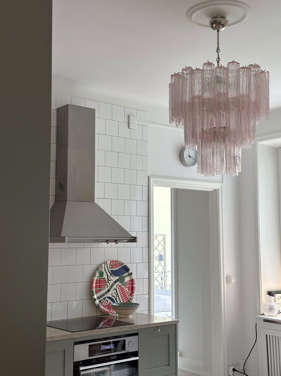 This large Pink Murano glass chandelier combines bold color with Mid-Century sophistication. Handcrafted in Murano, it features 56 pink tubular prisms that radiate soft, atmospheric light. With nine E14 light sources, it transforms living spaces, bedrooms, or dining rooms into stylish showcases.
