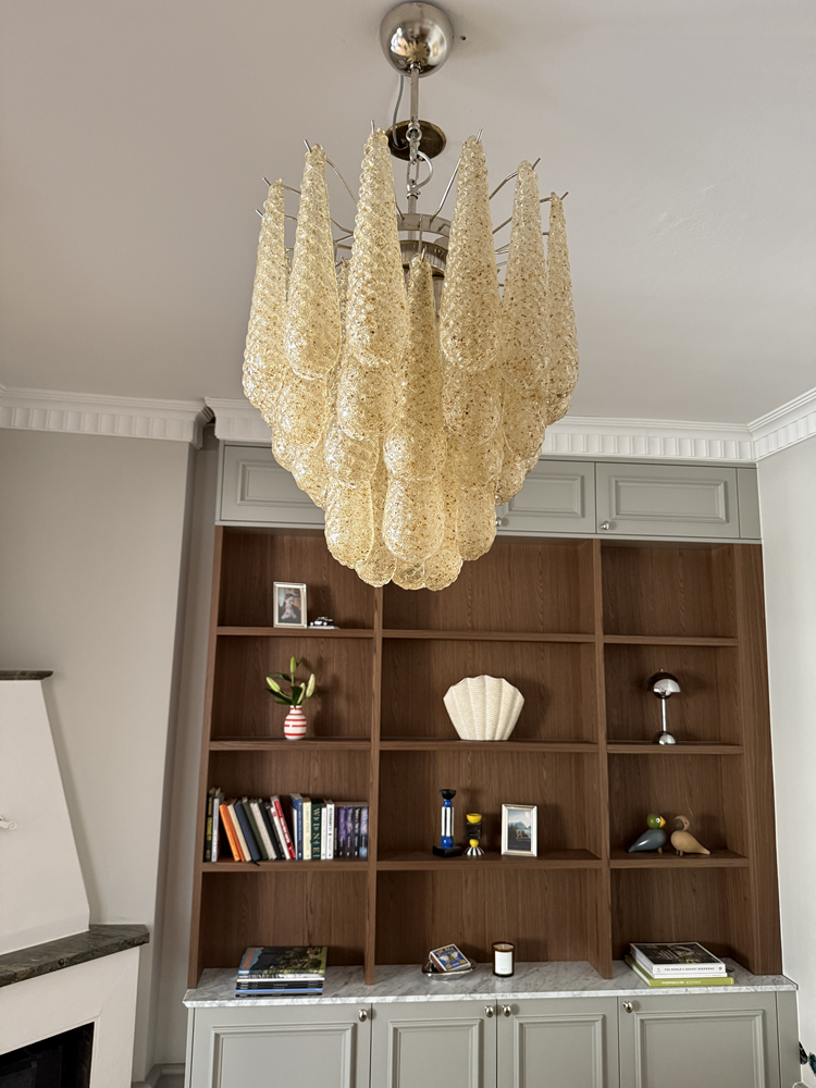 This medium Amber Murano glass chandelier, handcrafted in Italy, combines rich amber tones with timeless Mid-Century design. Featuring 41 amber drop prisms, it adds warmth and sophistication to dining areas, entryways, or modern living rooms. With five E27 light sources, it creates a welcoming, atmospheric glow.