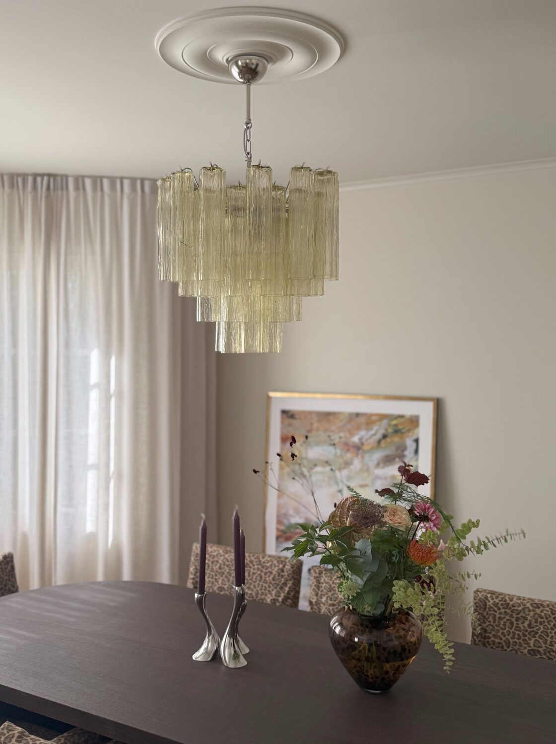 This medium Honey Murano glass chandelier brings warmth and charm to Mid-Century interiors. Featuring 36 honey-colored tubular prisms handcrafted in Murano, it adds an inviting atmosphere to dining areas, lounges, or bedrooms. With seven E27 light sources, it produces a rich, golden glow.