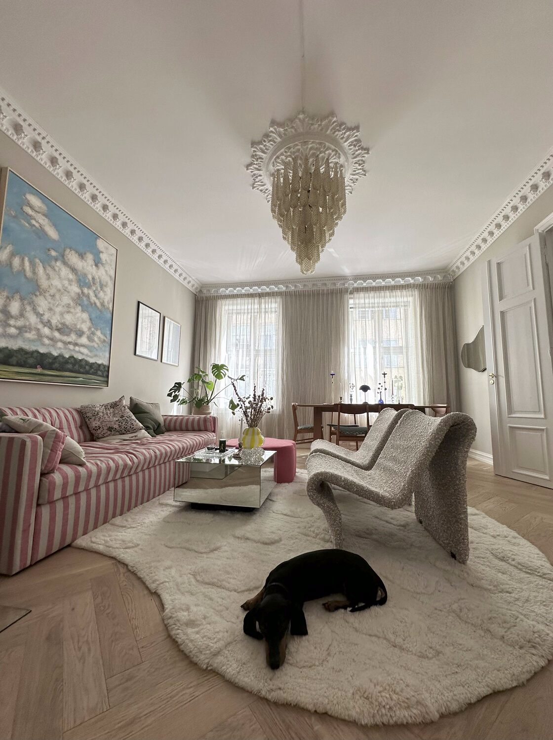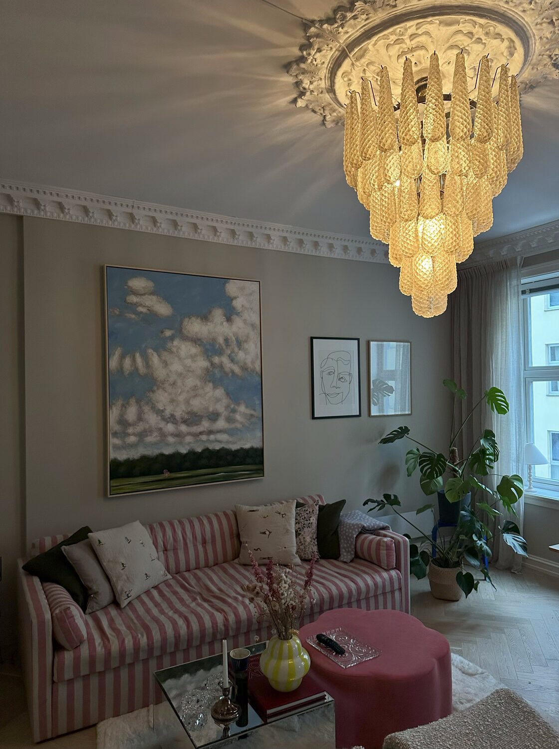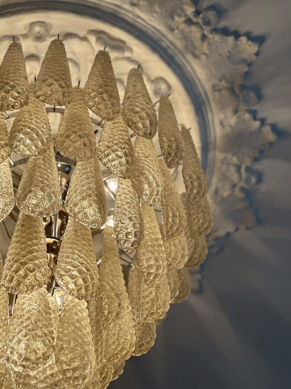A striking centrepiece, this XL Amber Murano glass chandelier is a statement of Italian artistry and Mid-Century design. Handcrafted in Murano, it features 75 amber drop prisms cascading to form a sculptural presence. With thirteen E14 light sources, it radiates a luminous, atmospheric glow—ideal for grand dining rooms, entryways, or spaces seeking an iconic focal point.